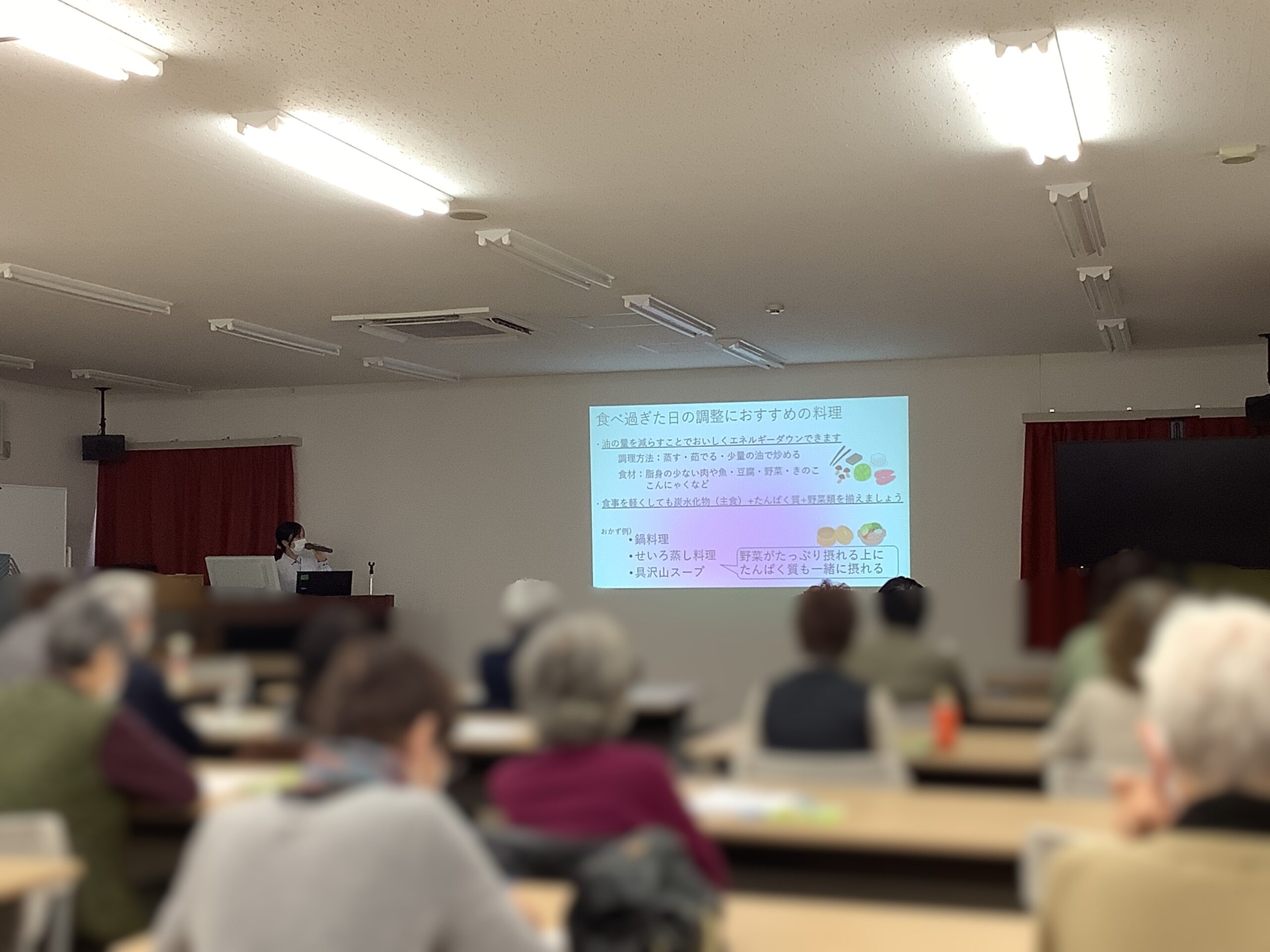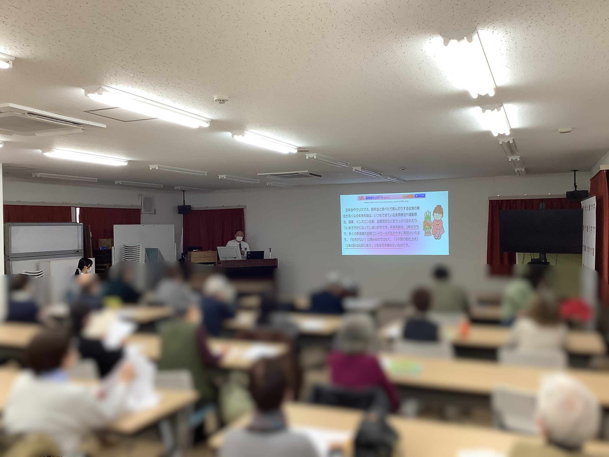 今回は年末年始の食事を楽しみましょうをテーマに糖尿病・生活習慣病センター長 及川医師より「食事療法の基準」、管理栄養士 橋本より「年末年始の食事を楽しもう」についてお話させていただきました。