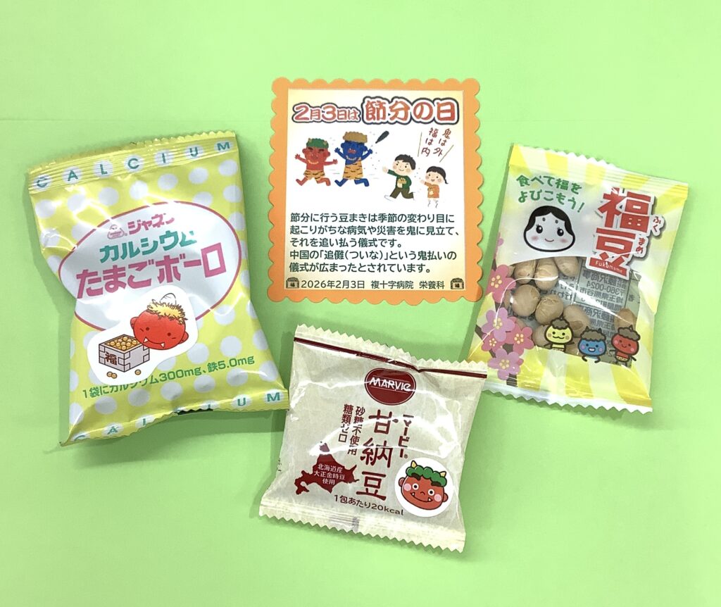 栄養科では2月3日の節分に福豆等の行事食および手作りの行事カードを提供いたしました。