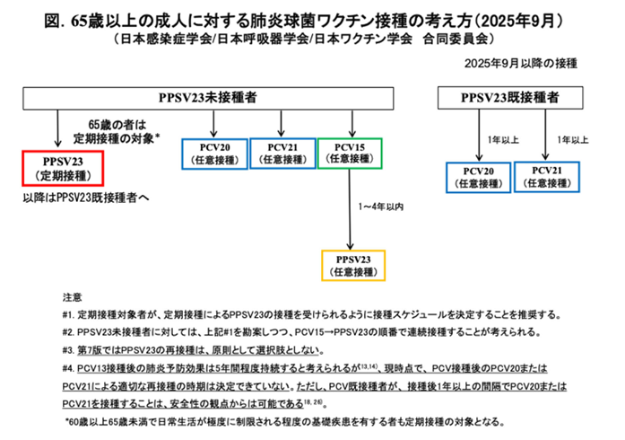 日本国内で成人に使用できる肺炎球菌ワクチンにはニューモバックスNP®(23価肺炎球菌多糖体ワクチン:PPSV23)、バクニュバンス(15価肺炎球菌結合型ワクチン:PCV15)プレベナー20 ®(20価肺炎球菌結合型ワクチン:PCV20)、キャップバックス(21価肺炎球菌結合型ワクチン:PCV21)の4種類があります。ニューモバックスNPは古くから使われてきたワクチンで、従来は一定の効果がありましたが、近年になり菌株交代現象が起きて有効性が低下してきたため、5年ごとの再接種は推奨されなくなり、65歳で行われる定期接種はプレベナー20に変更される予定となっています。日本呼吸器学会と日本感染症学会は、肺炎球菌ワクチンのあり方を下の図のように示しています。当院外来では、プレベナー20とキャップバックスの2種類のワクチンを接種することができます。これまでにいずれかの種類の肺炎球菌ワクチン接種を受けた方については、これら2種類のワクチンのどちらかを接種する際には最後の接種から1年以上の間隔を空ける必要があります。