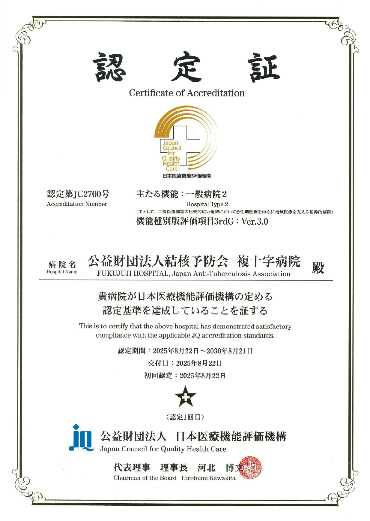 当院は、公益財団法人日本医療機能評価機構の認定を通じて、医療・看護の質の向上、安全な医療体制の整備、そしてチーム医療の充実を目指し、日々改善と努力を重ねています。患者さまにとって、より信頼される医療機関となることを目指しています。